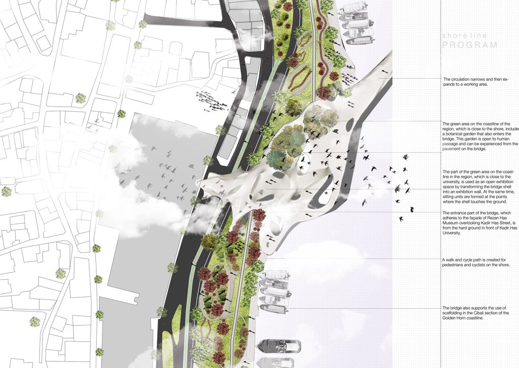 The bridge, designed in the name of this context, transforms into an functional organism that clings to the entire Golden Horn. The water thought to separate the two sides; has gained a meaning that connects disconnections on land. Existing bridges connecting two points on the Golden Horn are far from living with the Golden Horn. Bridges, which serve mostly vehicle traffic, are not usefull for ped